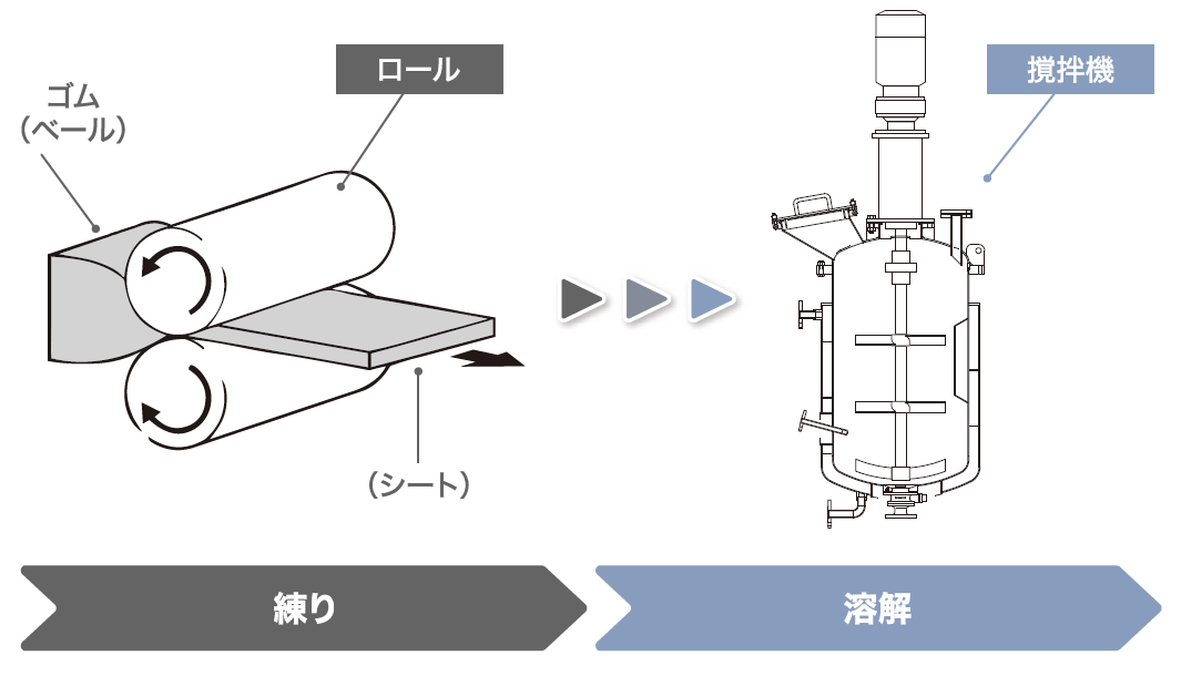 ゴムの「練り」と「溶解」、2つの加工をまとめて受託可能です。